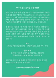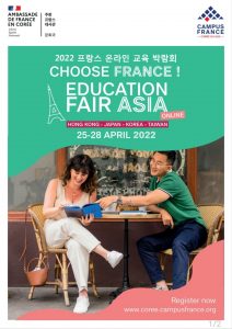 2022 프랑스 온라인 교육 박람회 Choose France ! Education Fair Asia 한국, 대만, 일본, 홍콩 주재 프랑스 대사관 및 Campus France에서 공동으로 주최하는 Choose France ! Education Fair Asia 행사가 오는 4월 25일부터 28일까지 온라인으로 개최됩니다. 이번 행사를 통해 다양한 분야의 프랑스 고등 교육 기관이 온라인 박람회 플랫폼 상에서 학생들을 만날 예정입니다. 본 행사는 4일동안 각 학교별 라이브 세션으로 진행됩니다. 박람회 이전 행사 사이트에서 학교별 소개 영상 및 자료를 미리 확인하실 수 있으며, 입학 전형, 장학금, 졸업 후 진로 등 궁금한 사항에 관해 질문을 남기시면 추후 학교별 라이브 세션에서 학교 관계자로부터 상세한 답변을 받으실 수 있습니다. 일시 2022년 4월 25일(월요일) – 28일(목요일), 오후 4시 - 8시 참가 학교 상경계ᆞ이공계 그랑제꼴, 예술 학교, 국립대학, 전문 학교(요리 및 호텔경영), 어학기관 등 참가 학교 리스트 및 행사에 관련된 자세한 정보는 본 기관 홈페이지에서 확인하실 수 있습니다. www.coree.campusfrance.org 관심있는 여러분의 많은 참여 바랍니다. 감사합니다.